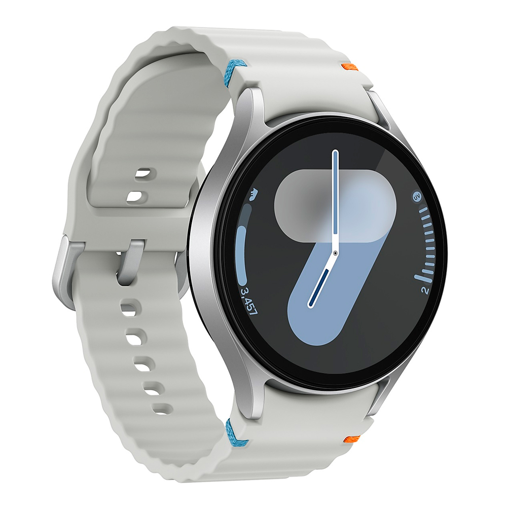 Smartwatch Samsung Galaxy Watch7 44mm Bluetooth, cor prata, ideal para saúde, esportes e conectividade. Possui tela Super AMOLED de alta resolução com cristal de safira para maior resistência.